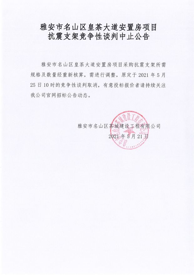雅安市名山區(qū)皇茶大道安置房項(xiàng)目抗震支架競(jìng)爭(zhēng)性談判中止公告